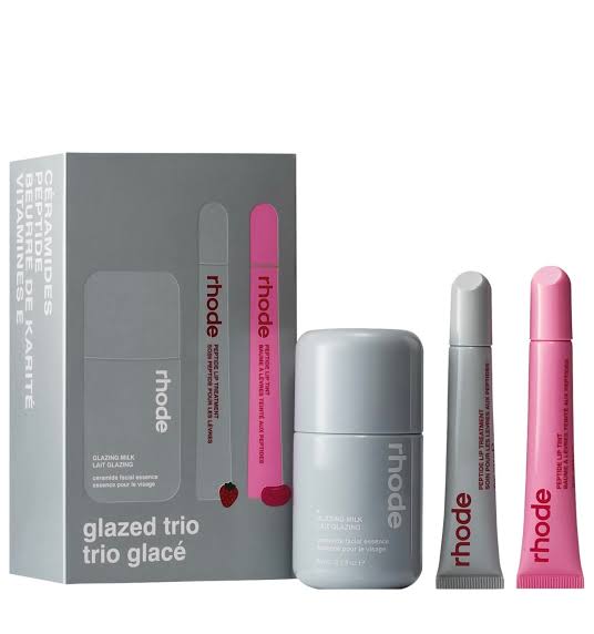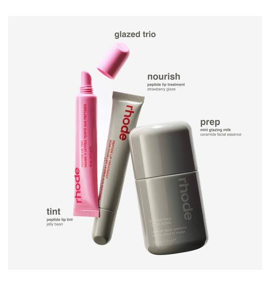 Este set incluye 3 de los productos más vendidos de la marca , la glazing milk en tamaño mini, Rhode lip treatment strawberry glaze y lip tint jelly bean en tamaño full size